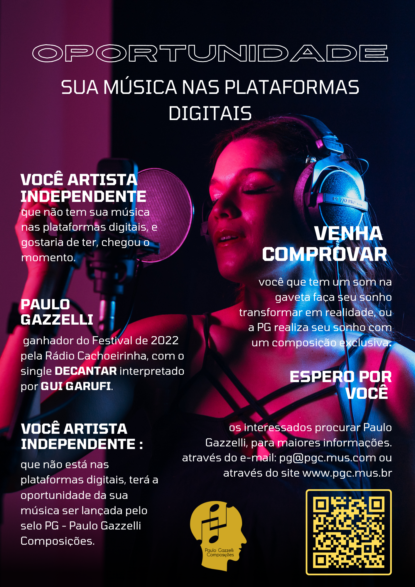 Você artista independente, que não está ou está nas plataformas musicais, terá a oportunidade da sua música ser lançada pelo Selo - PG - Paulo Gazzelli Composições.